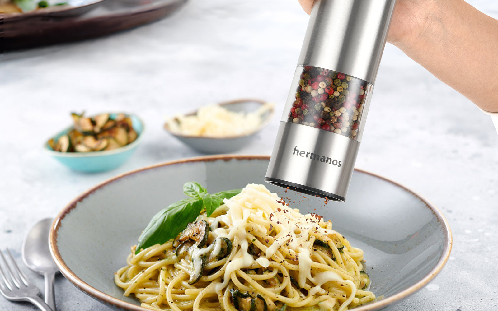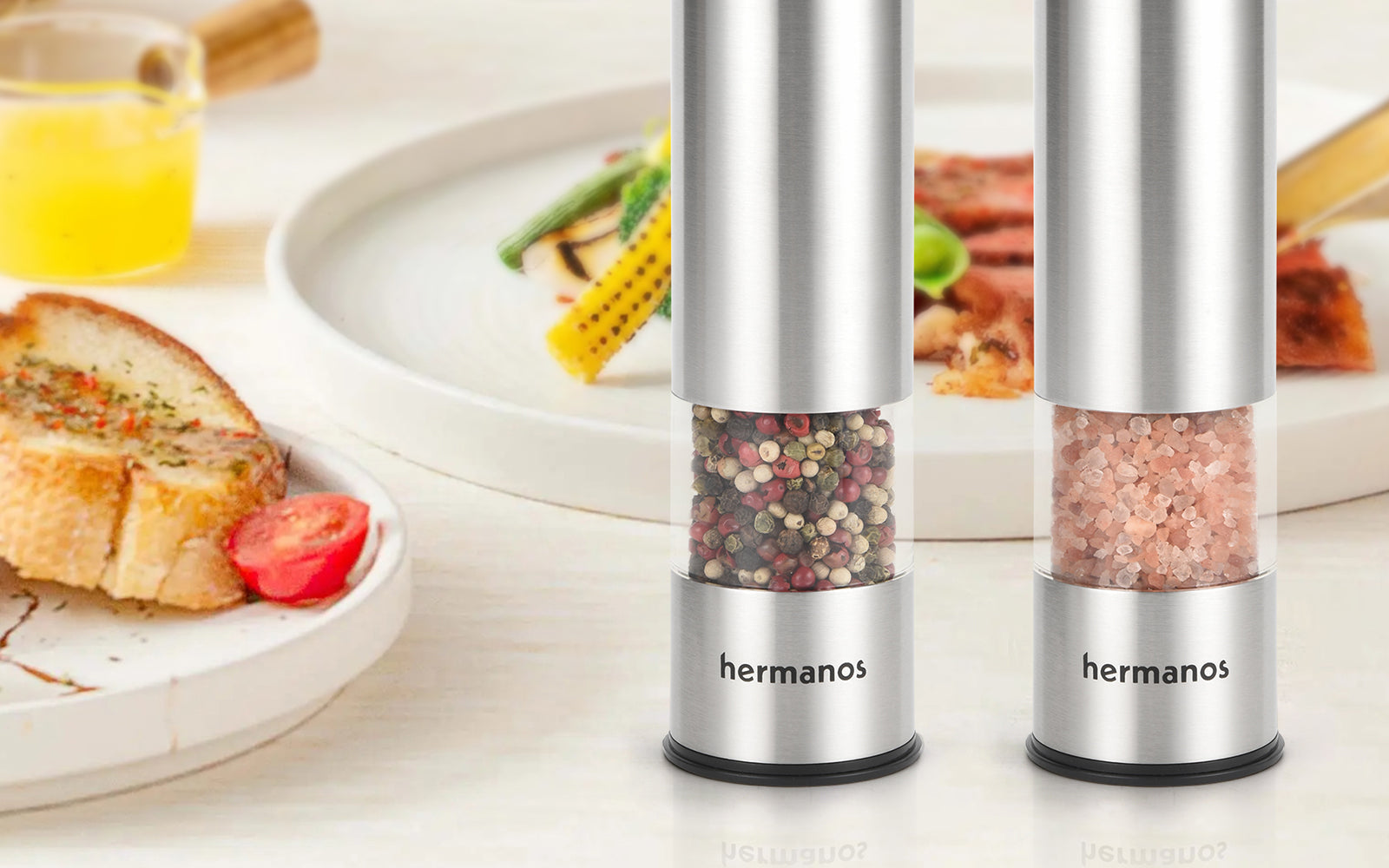 Bij Hermanos geloven we dat gemak en stijl hand in hand kunnen gaan. Met de elektrische bediening maal je peper of zout met slechts één druk op de knop. Geen gedraai, geen kracht zetten – gewoon moeiteloos doseren terwijl je met de andere hand roert, bakt of serveert.